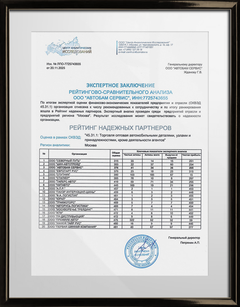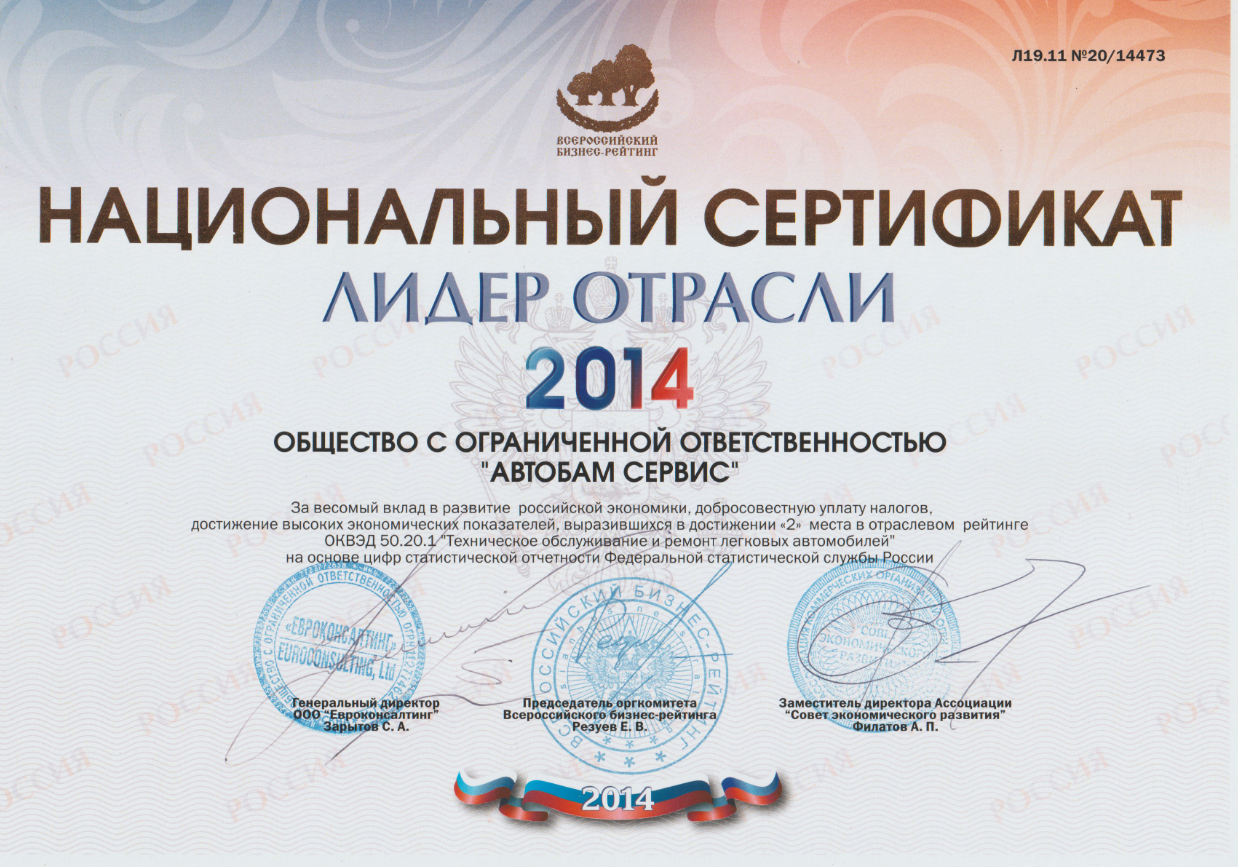 В 2020 г. ООО «Автобам Сервис» удостоилось статус-наградой «Лидер отрасли 2019». Награда была присвоена оргкомитетом Всероссийского бизнес рейтинга, где нашей компании выразили почтение и уведомили о том, что согласно проведенному Всероссийским бизнес рейтингом ранжированию компаний Российской Федерации, предприятие ООО «Автобам Сервис» вошло в ТОП-лучших в нашем виде деятельности.